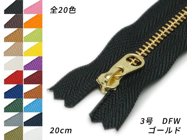 【YKK】金属ファスナー 3号 ゴールド DFW 全25色 20cm【メール便対応】 [レザークラフトぱれっと] レザークラフトファスナー 20cm