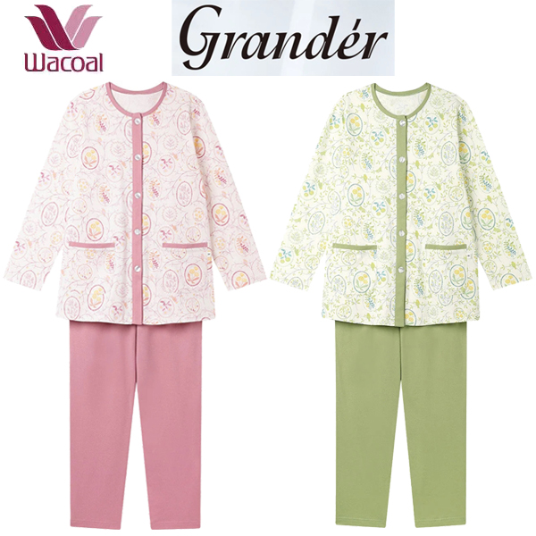 ワコール グランダー オーガニックコットン 100%ニット素材 丸首前開き全開ボタン留め 長袖パジャマ SP MP LPサイズ CDX529