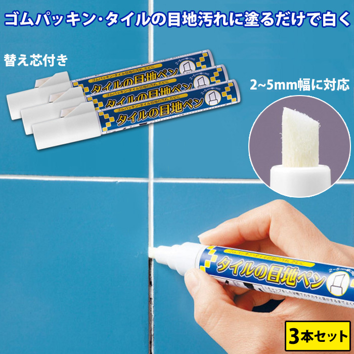 タイルの目地ペン 3本セット 浴室 壁 床 風呂カビ 黒カビ ゴムパッキン 防カビ剤配合 補修ペン インキ 目地を白くする 黒カビを隠す 白く塗る 目地 補修剤