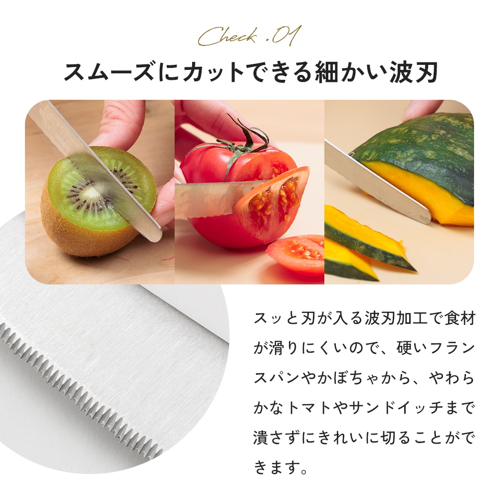 細かい波刃が食材をしっかり捉え、やわらかい食材もスムーズにカットできます。