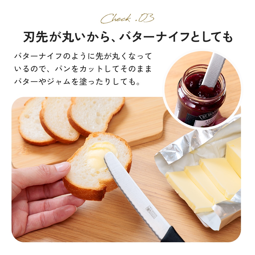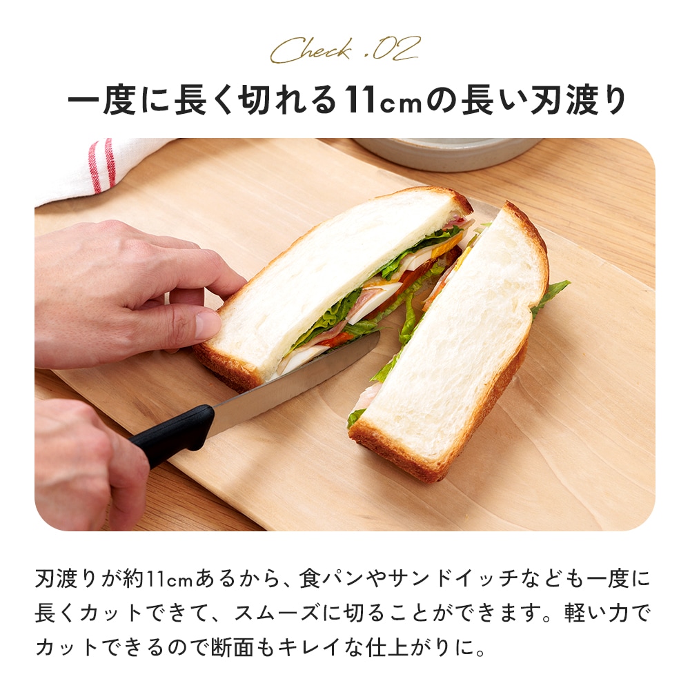 ハンドルは手にフィットして持ちやすく、バターナイフとしても使えるほか、(約)11cmの長い刃渡りで一度に長く切れます。