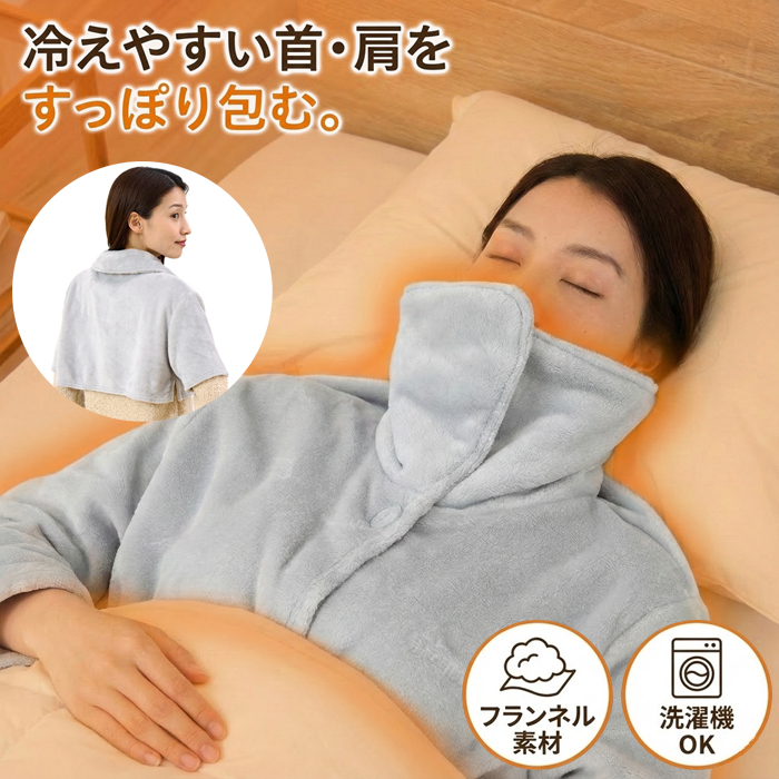 この《フランネル肩口あったか着る毛布》なら、ふわふわの極細フランネル素材が、首元から肩までやさしく包み込み、布団がずれてもあたたかさをキープ。