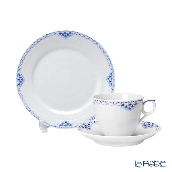 コペンハーゲンブルーと呼ばれる独特の色調と、伝統に培われた手工芸の技が魅力的。白地を生かしたこのシリーズは、1978年の作で、美しいレースの縁取りとレリーフで飾られた模様がポイント。宝石を散りばめた皇女様のティアラを思わせます。日本人にとってこの染付け柄は、和食器のように親近感があり、根強い人気があります。