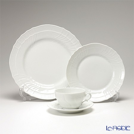 ジノリ1735/リチャード ジノリの永遠の定番といえるのがベッキオホワイト。硬質磁器の代名詞とされるほどです。バロック様式の格調高いシェイプは、規則正しいバスケットの編み込み模様と、中心に向かって大胆に入ったレリーフのラインが特徴です。