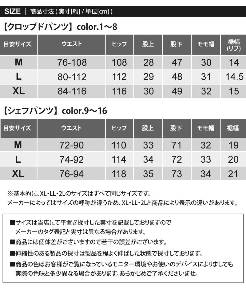 股下は選べるクロップドパンツとシェフパンツの2タイプ!