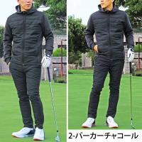 ダウンジャケットとダウンパンツのゴルフウェア上下セットアップ。