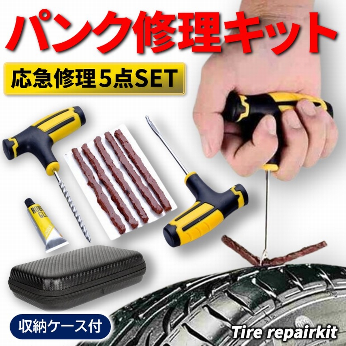 車 タイヤ パンク修理キット パンク修理セット パンク 修理 バイク チューブレスタイヤ リペア 5回分 釘 穴 補修 車載 工具 収納ケース 5点セット 爆買