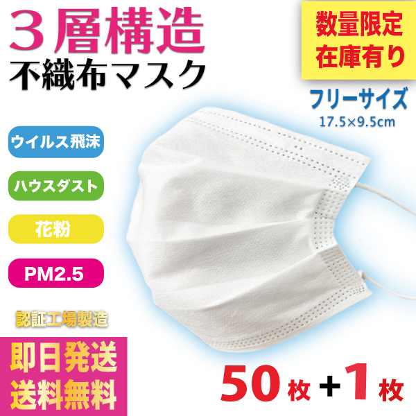 マスク 不織布 50枚 マスク 使い捨て マスク 大人用 ホワイト 不識布マスク 三層構造 プラス 1枚 即納 お得