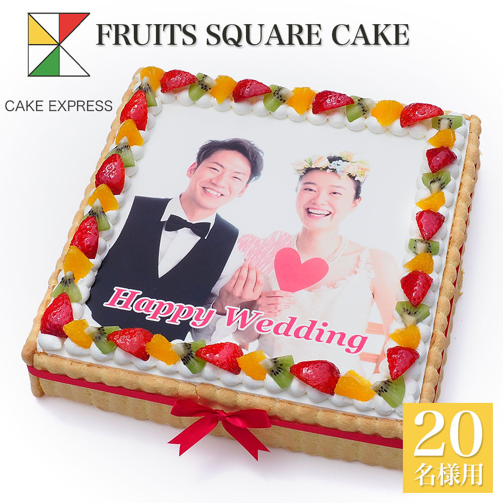 | 商品名 | 写真ケーキ スクエア型 ビスキュイ付フレッシュフルーツ乗せ生クリームショートケーキ 28×28cm 18〜20名様用 |