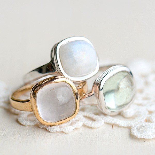 ぷるんとしたスクエアカボションのカラーストーンがキュートなリングです。