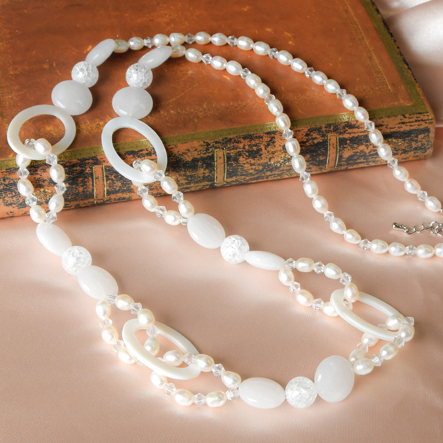 ホワイトカラー ロング ネックレス 真珠 クォーツァイト 水晶 白蝶貝