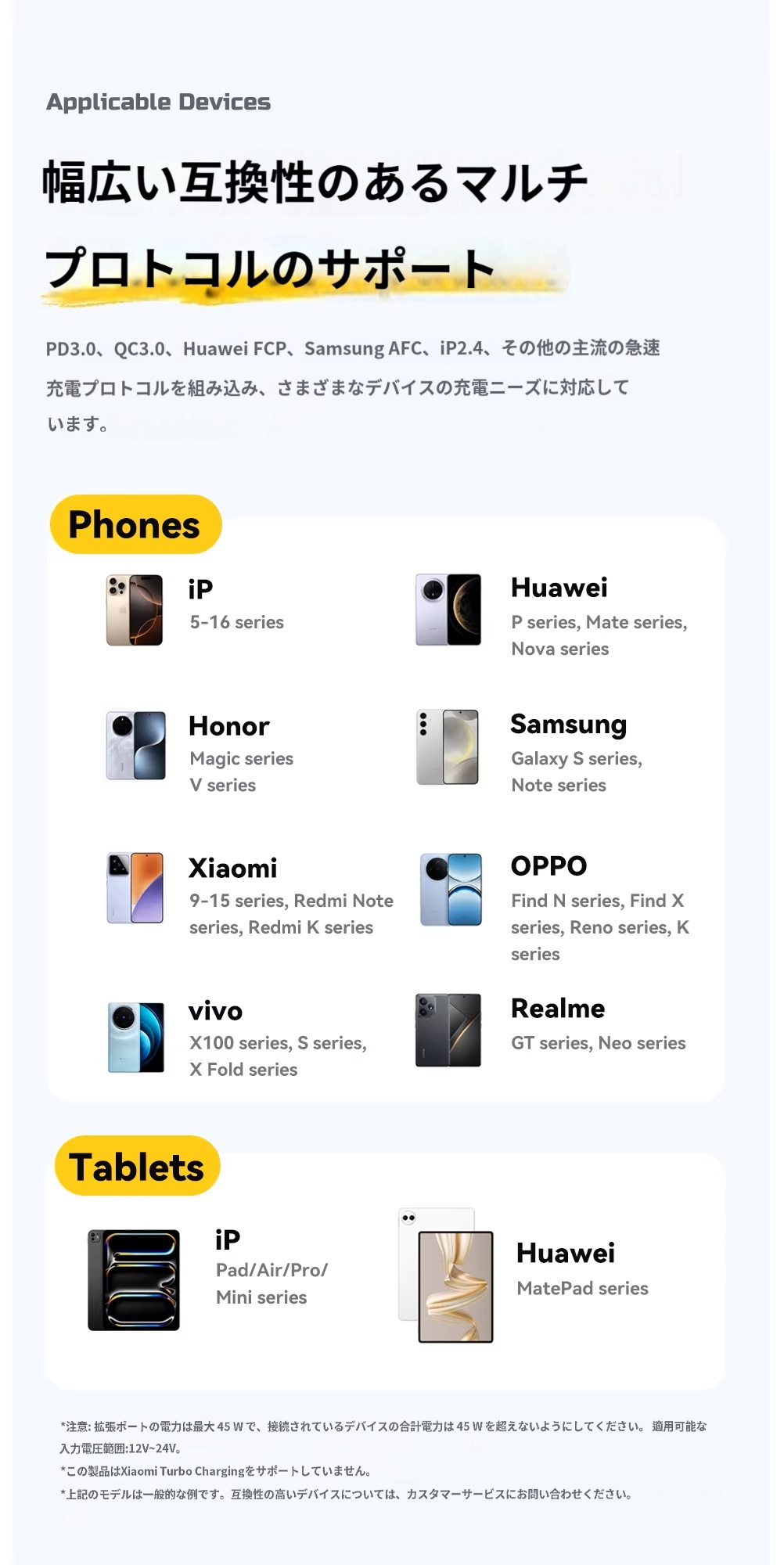 3.デバイスの制限なし、複数の充電プロトコル (pd3.0/qc3.0/fcp/samsung/apple 2.4) と互換性あり。