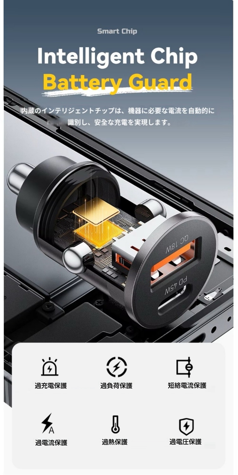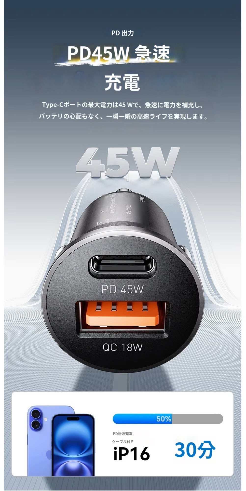 シガーソケット充電器 USB&タイプC 2ポート対応 急速充電 シガーソケット充電 45W 車充電器 カーチャージャー 充電器 iPhone/iPad/Android各種対応 1個