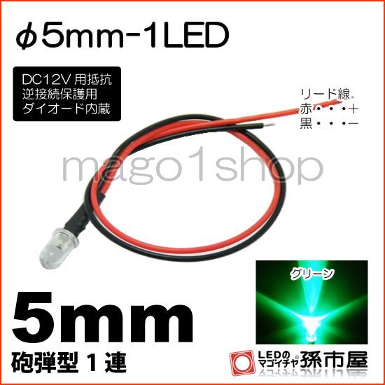 LED Φ5mm 1LED-緑/グリーン砲弾型LEDDC12V用抵抗、逆接続保護用ダイオード内蔵リード線付属 孫市屋