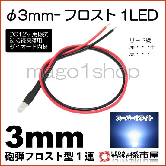 LED Φ3mm フロスト1LED 白 ホワイト砲弾型LEDDC12V用抵抗、逆接続保護用ダイオード内蔵リード線付属 孫市屋