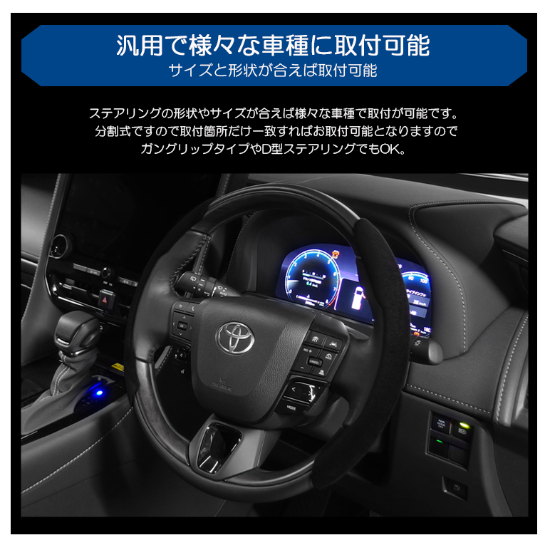 ※分割式により形状や取付位置によってはガングリップやDシェイプタイプのステアリングにもお取付可能となりますが、事前にハンドルの形状等をご確認下さい。