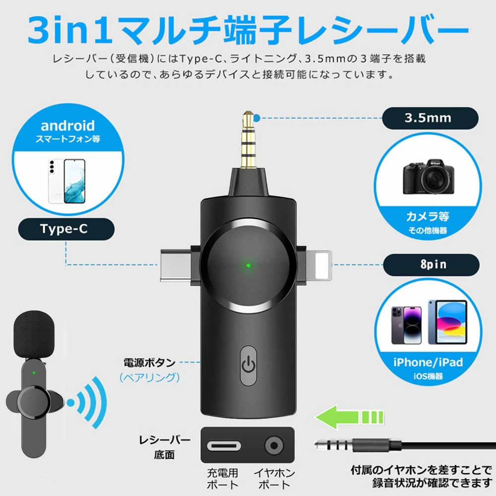 ピンマイク 干渉防止 3.5mm/Type-C/8Pin ワイヤレスマイクロホン プラグ&プレイ APP不要 外付けマイク ステレオミニ クリップマイク 充電式 録音 会議 高音質 無線 超軽量 音遅延なし 講演会/収録/授業/プレゼン/司会/ライブイベント YouTube TikTok Facebookなどに