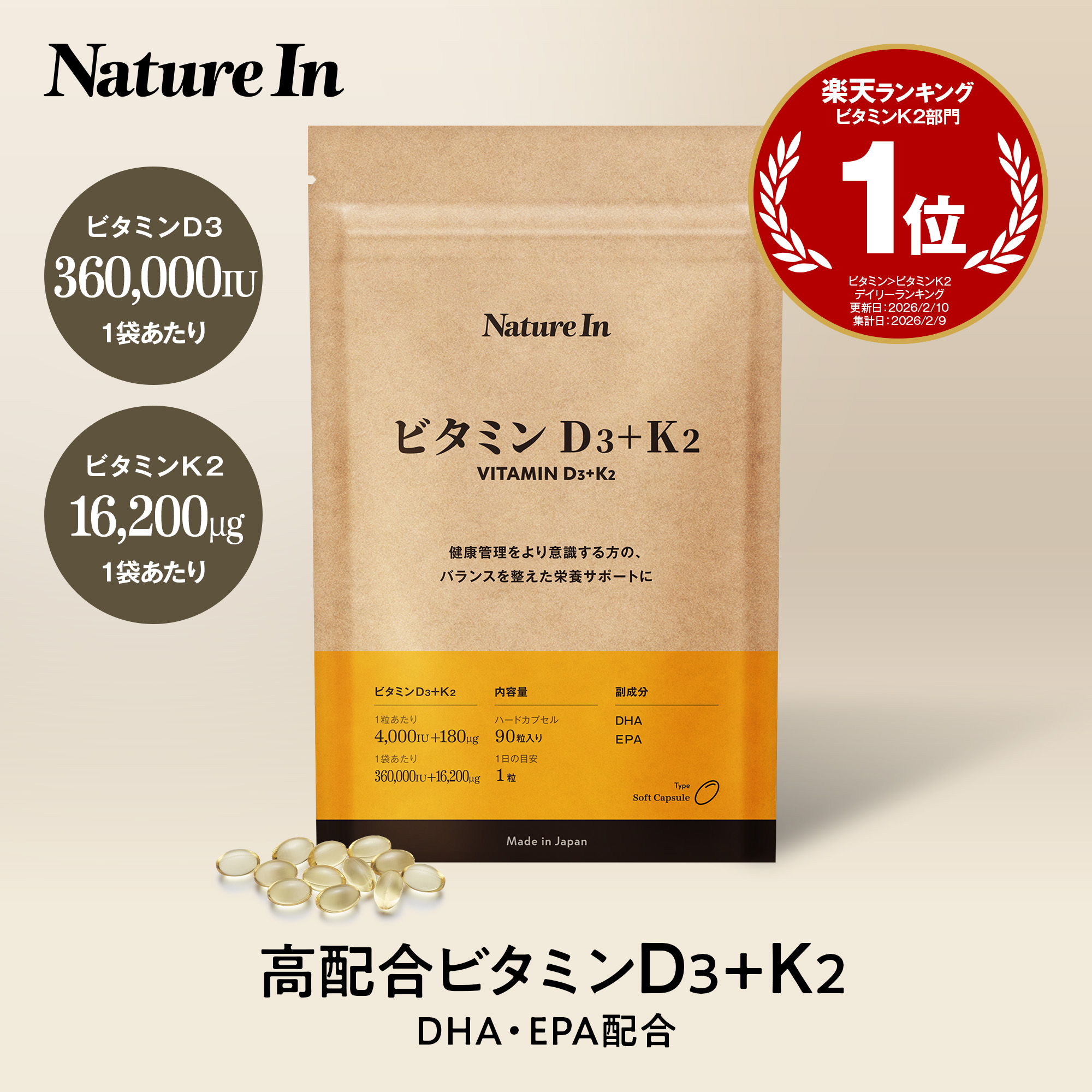 | 用途・ワード | ビタミンD3、ビタミンK2、ビタミンD、ビタミンK、D3 K2 サプリ、栄養補助食品、健康、栄養、生活習慣、ミネラルバランス、食生活サポート、インナーケア、コンディション管理、健康意識、年齢対策サプリ、男性向け、女性向け、日本製、国内製造、ソフトカプセル、1日1粒、Nature In |