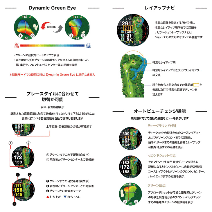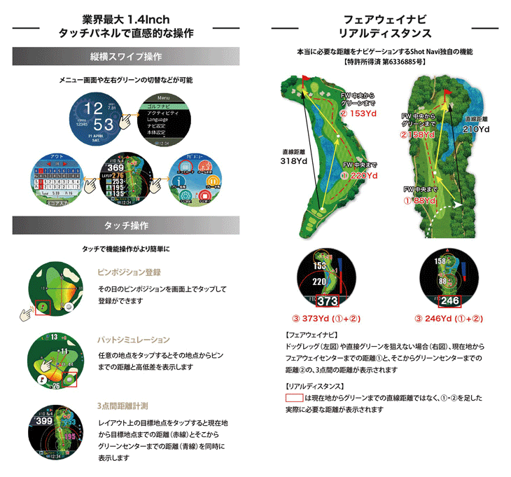 1.4インチの大型カラーディスブレイにタッチパネル方式を採用し、タッチ操作やスワイプ操作などによって直感的な画面の切り替えを可能にしました。従来のレイアップナビ機能(事前に得意距離の設定をしておくことで、その設定した得意距離が残るようにレイアップ距離を案内)やグリーンディレクション機能(直接グリーンが見えない場面で、現在地からグリーンの方向を矢印でサポート)に加えて、現在地から見たグリーン形状やヒートマップ(色彩)によるグリーン起伏を表示するダイナミックグリーンアイ機能を搭載しています。