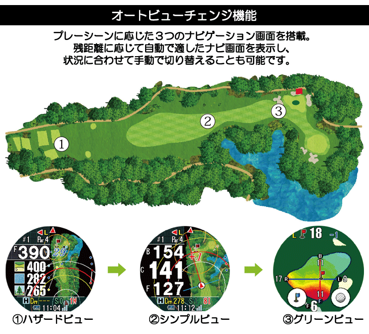 グリーンの起伏をヒートマップで表示するグリーンアイ機能は、グリーンをリアルタイムに自動回転して表示し、戦略的なプレーが可能です。新搭載のタッチスクリーンでは、縦横スワイプ操作に加えて、ピンポジション登録、パットシミュレーション、3点間距離計測が簡単に行えます。ピンポジション登録では、その日のピン位置を画面上でタップして簡単に登録でき、パットシミュレーションでは任意の地点をタップするとその地点からピンまでの距離と高低差が表示されます。さらに、3点間距離計測では、レイアウト上の目標地点をタップすることで、現在地から目標地点までの距離とそこからグリーンセンターまでの距離が同時に表示されます。反射型カラー液晶を採用しているため、屋外でも見やすく、フルレイアウト表示で豊富な情報を提供します。また、フェアウェイナビ・リアルディスタンス機能、オートビューチェンジ機能、グリーンディレクション機能の便利な機能も搭載されています。高精度の準天頂衛星「みちびきL1S」に対応しており、正確な測定を実現します。さらに、競技モードも搭載されており、公式競技での使用も可能です。