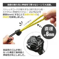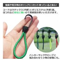 太すぎず細すぎない直径6mmのストレッチコードには抜群の耐久性と伸縮性があります。テントやタープ、天幕を固定しているペグとロープの間にプラスすることで、強風、風や揺れなどによる衝撃を吸収し、ロープにかかる負荷を分散。ペグを抜けにくくし、ロープの緩みも軽減してくれます。