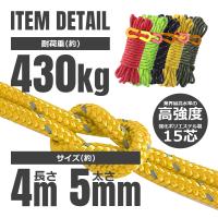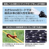 強化ポリエステル製テントロープ。ロープにテンションをかけたいときなどに使う自在金具付き。業界最高水準の高強度で耐荷重は約430kg。太さ約5mmのパラコードなので頑丈、テントやタープをしっかりと固定します。引張強度が高く、ほつれや緩み、劣化にも強いので、安心してご使用いただけます。