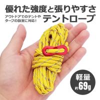 強化ポリエステル製テントロープ。ロープにテンションをかけたいときなどに使う自在金具付き。業界最高水準の高強度で耐荷重は約430kg。太さ約5mmのパラコードなので頑丈、テントやタープをしっかりと固定します。引張強度が高く、ほつれや緩み、劣化にも強いので、安心してご使用いただけます。