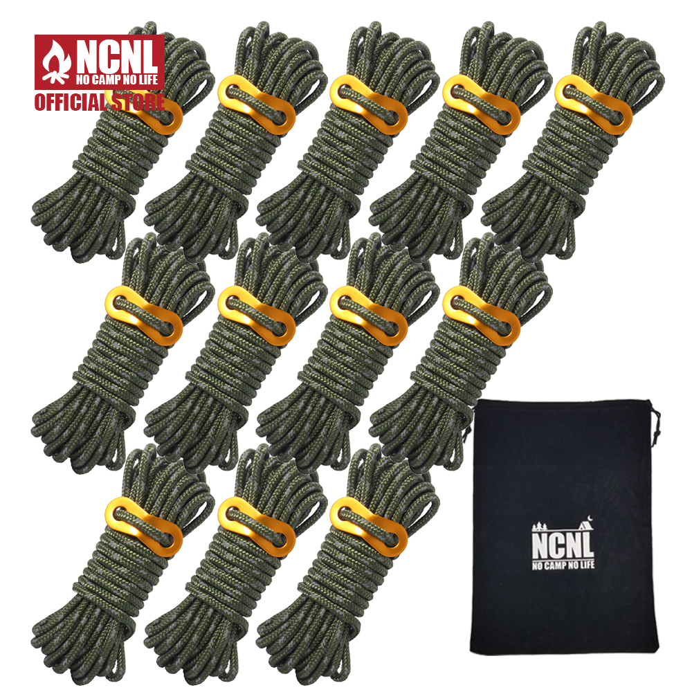 NCNL NO CAMP NO LIFE パラコード テントロープ ガイロープ 反射材入り 耐荷重 430kg 太さ 5mm 長さ 4m 自在金具 収納袋付き (オリーブ 12本セット)