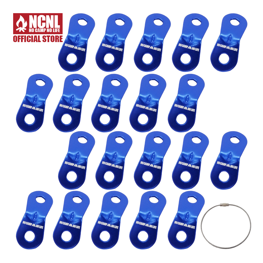 NCNL NO CAMP NO LIFE 自在金具 二つ穴型 ブルー 20個 アルミ テント タープ ロープ 長さ調整 ロープテンショナー ガイラインライナー 収納用ワイヤー付き