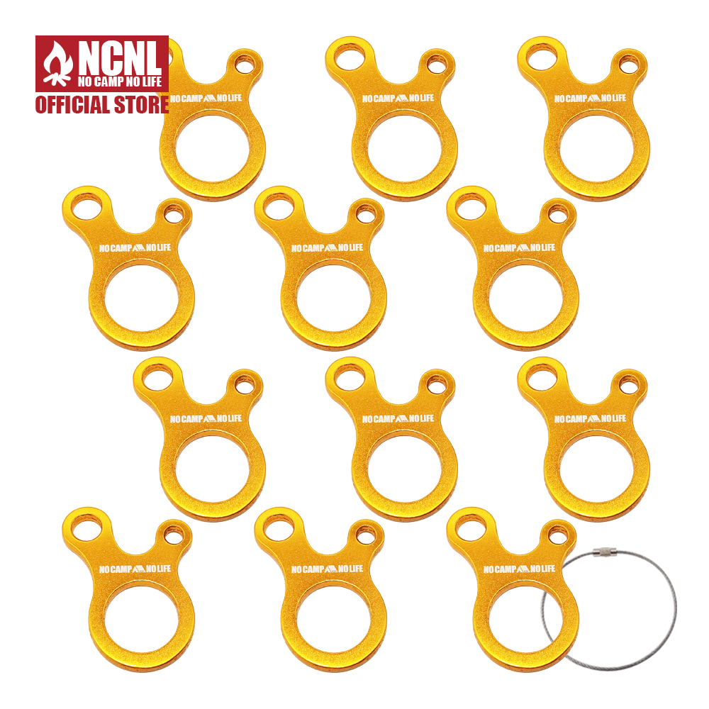 NCNL NO CAMP NO LIFE 自在金具 カタツムリ型 ゴールド 12個 アルミ テント タープ ロープ 長さ調整 ロープテンショナー ガイラインライナー 収納用ワイヤー付き