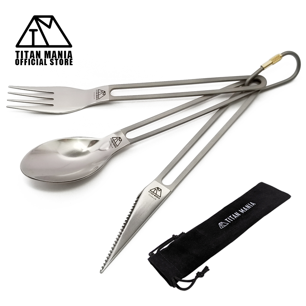 TITAN MANIA チタンマニア カトラリーセット チタン製 超軽量 頑丈 スプーン フォーク ナイフ キャンプ 調理器具 キャンプ用品 カラビナ付き 収納袋付き
