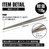 超軽量で頑丈!錆にも強いチタン箸。長さ19cmで四角い形状とマットな質感で手になじみやすく握りやすい四角箸。一般的なケース入りのお箸と同じくらいのサイズ感で、少し短めのコンパクト設計。ざらつきがなく手触りと口当たりが良い少し小さめのハシの先端には滑り止め加工が施されているのでしっかり掴みやすい。