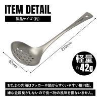 軽量で頑丈!ソロキャンプ時の使用にちょうど良いサイズ感で、具材だけを取り出すのに適した錆に強いチタンレードル(穴あきおたま)。揚げ物や茹でた食材の取り出しに便利な穴あきタイプ。チタン製で焚き火やバーナーなど直火に対応可能。お玉の先端はクッカーや鍋の側面にフィットしやすい楕円型なのですくいやすい。