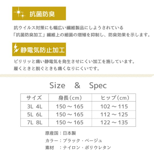 | サイズ | 3L〜4L ヒップ 102〜115cm 身長 150〜165cm 5L〜6L ヒップ 112〜125cm 身長 150〜165cm 7L〜8L ヒップ 122〜135cm 身長 150〜165cm |