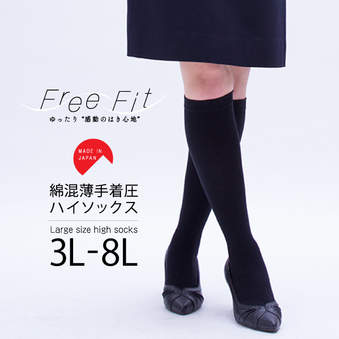 3/11〜3/16セール 大きいサイズ 綿混 薄手 着圧ハイソックス 履き口ゆったり 3L〜8L メール便2足まで発送可 piedo FreeFit(フリーフィット)