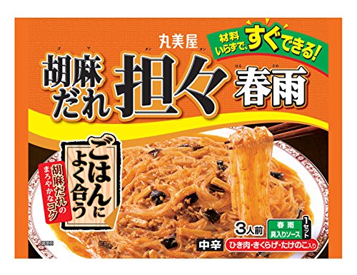 原材料:具入りソース/野菜(きくらげ、筍)、鶏肉、胡麻、砂糖、醤油、胡麻油、食塩、エキス(ポーク、酵母、チキン、鰹)、米酢、発酵調味料、粒状植物性蛋白、香味油、調製豆乳粉末、甜麺醤、豆板醤、調味料(アミノ酸等)、増粘剤(加工澱粉、キサンタン)、着色料(カラメル、カロチノイド)、香辛料抽出物、甘味料(ステビア)、(原材料の一部に小麦を含む) 春雨/緑豆澱粉、えんどう豆澱粉