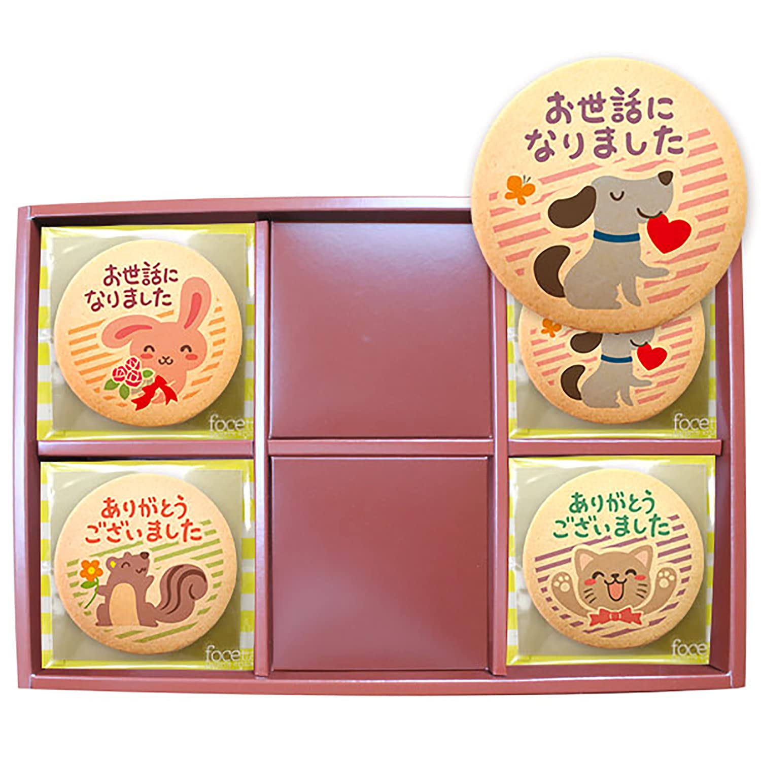 お世話になった方への感謝を伝えるメッセージクッキーは、転勤や退職、卒業、お別れの際のお礼やご挨拶にお渡しするお菓子としてご活用頂いております。ポップな動物のイラストがプリントされたプリントクッキーです。