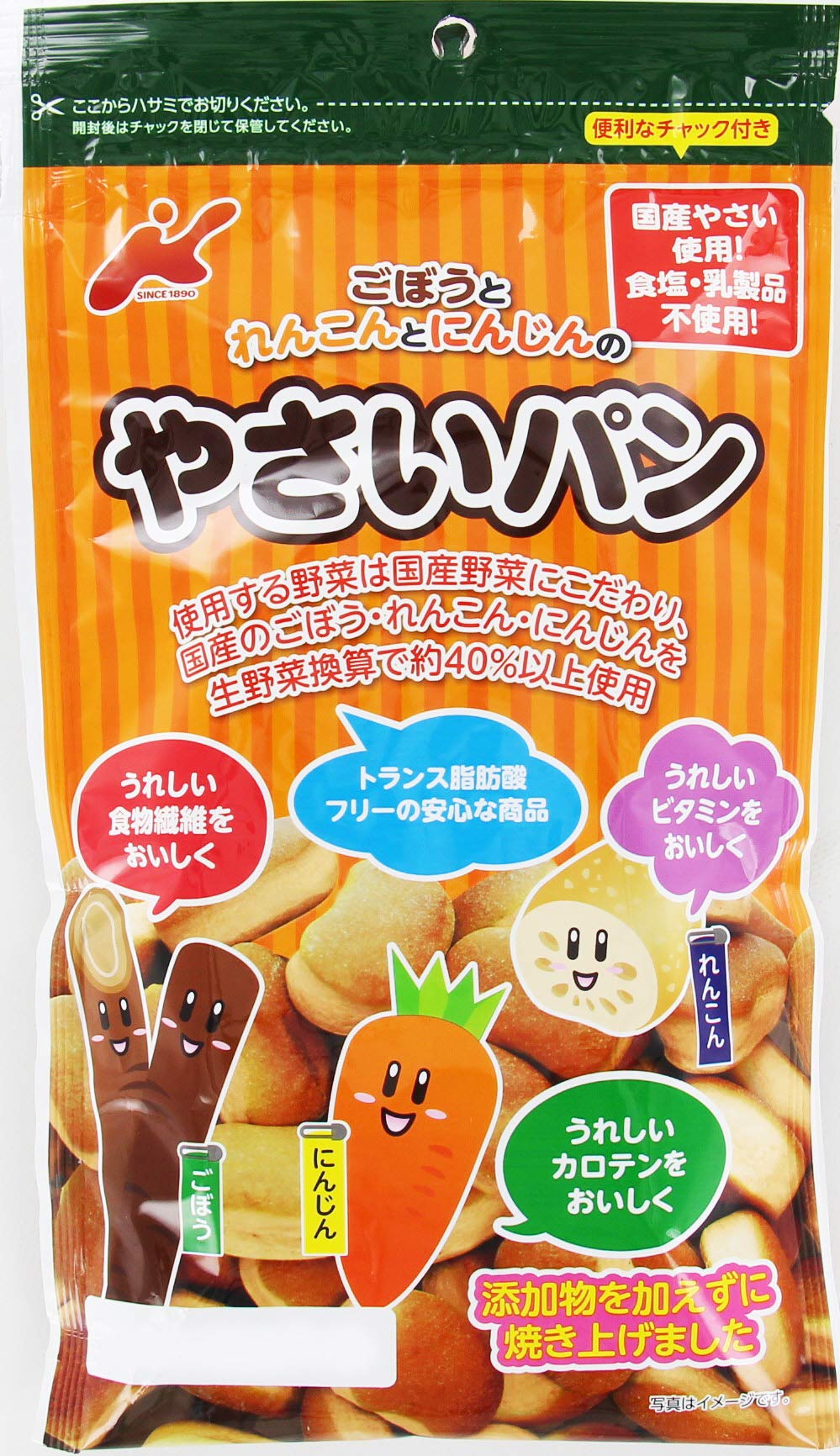 原材料:小麦粉(国内製造)、糖類(砂糖、ブドウ糖、イソマルトオリゴ糖シロップ)、植物油脂(ショートニング、なたね油、大豆油)、野菜粉末(ごぼう粉末(国産)、れんこん粉末(国産)、にんじん粉末(国産))、パン酵母、でん粉(小麦を含む)、