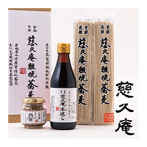 商品名:慈久庵 粗挽蕎麦(あらびきそば)、慈久庵 万能元だれ「本返し」、「醤(おひしょ・ひしお)」、化粧箱入り蕎麦と本返しと醤(おひしょ・ひしお)の詰め合わせ