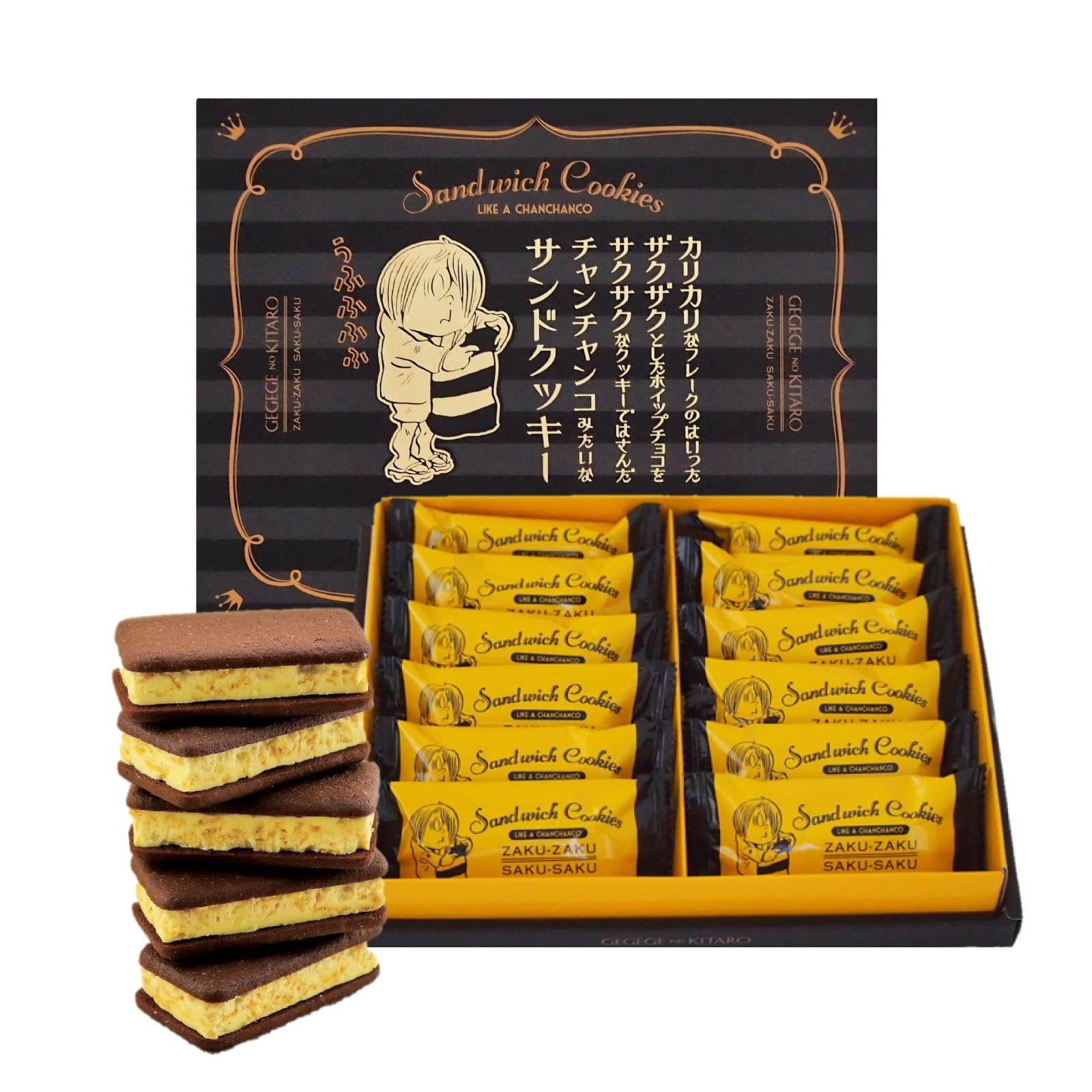 「ゲゲゲの鬼太郎」で有名な水木しげる先生は、鳥取県境港市出身。 境港には“水木しげるロード”と呼ばれる商店街があり、多くの観光客が訪れる人気スポットとなっています。 そんな鬼太郎の黒と黄色の縞柄のちゃんちゃんこをイメージしたサンドクッキーが誕生しました! プリン風味のエアチョコをサクサク食感のカラメルクッキーでサンドした、スイーツ好きにも鬼太郎好きにもおススメの一品です。