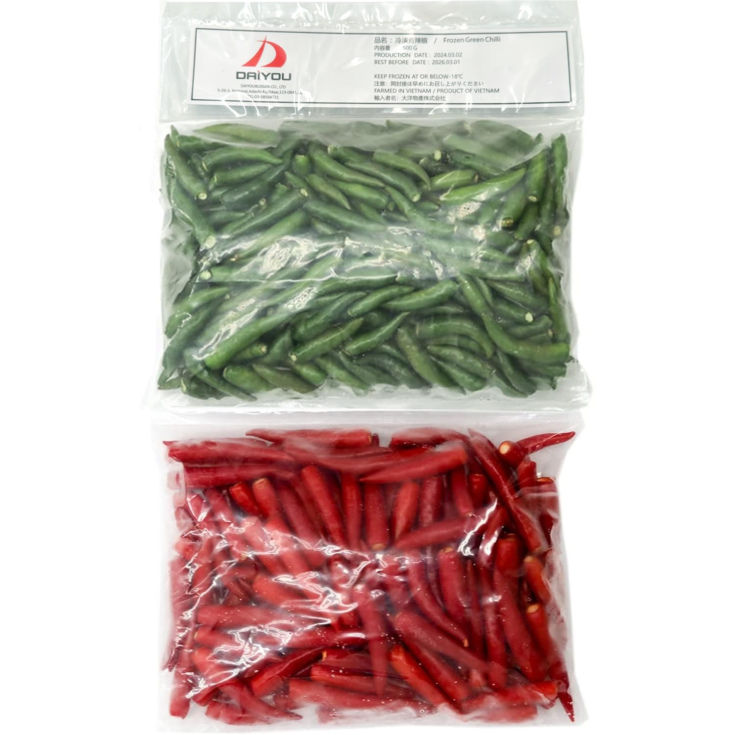 商品名:大洋物産 冷凍唐辛子 トウガラシ 業務用 中華食材 激辛ベトナム産1000g (500g*2袋) (青500g+赤500g)