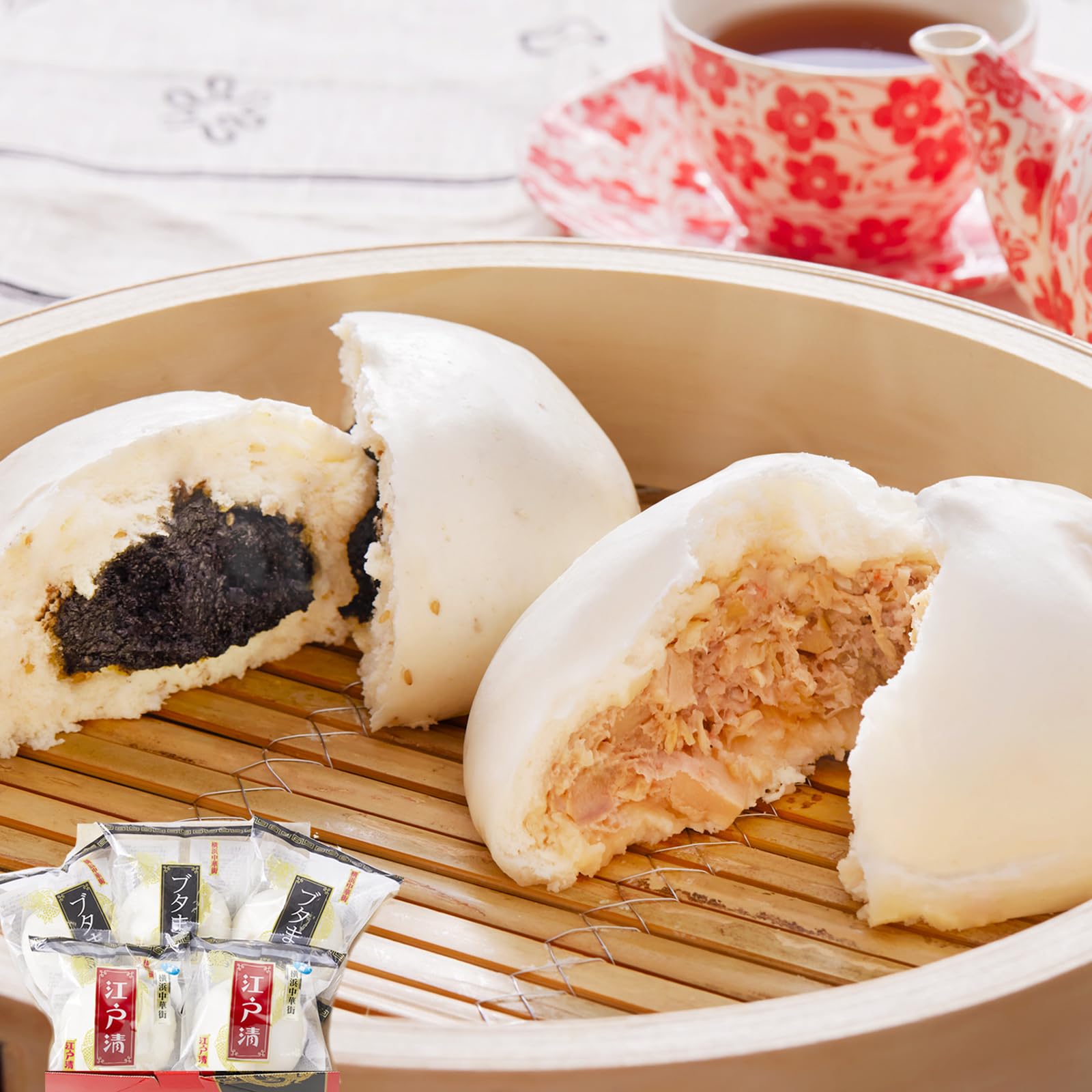 横浜中華街 江戸清の人気商品、ブタまん3個クルミ入り黒ゴマあんまん2個をセットでお届けいたします!