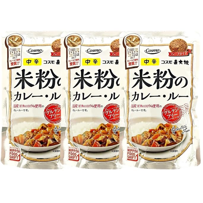 グルテンフリーで美味しくヘルシーな、国産米粉100%使用のカレールーです。「直火焼製法」で焼き上げた、使いやすいフレークタイプです。 ◎CURRY OF THE YEAR 2017 カレールウ部門 受賞◎国産米粉100%使用のカレールーです。フレークタイプ◎小麦粉不使用。国産米粉を使いグルテンフリーで仕上げました。まろやかでコクのあるカレールーです。【商品詳細】■名称:カレールー(中辛)■原材料名:食用油脂(国内製造)、米粉、ひよこ豆粉、カレー粉、食塩、トマトペースト、砂糖、チャツネ、酵母エキス、発酵乳、肉エキス、りんごピューレ、おろし玉ねぎ、カレーペースト、おろしにんにく、(一部に乳成分・豚肉・りんご・鶏肉を含む)■内容量:110g■賞味期間:1年■保存方法:直射日光を避け、高温にならない所で保存してください。■製造者:コスモ食品株式会社*本品は「グルテンフリー」を目的としており、小麦アレルギーの方に対応するものではありません。*この商品はカレールーです。レトルト品ではありません。*本品の中にはルーだけで乾燥剤等は入っておりません。*開封後は冷蔵庫で保存し、お早めにご使用ください。【おいしいカレーの作り方】●材料(4〜5皿分)・肉…200g・玉ねぎ…中1個(200g)・にんじん…中1本(150g)・サラダ油…適量・水…500ml(カップ2杯半)・本品…1袋(110g)●作り方(1)鍋にサラダ油を熱し、ひと口大に切った肉、薄くスライスしたにんじんをよく炒めます。(2)フライパンにサラダ油を熱し、薄くスライスした玉ねぎをあめ色になるまでよく炒め、鍋に移します。(3)鍋に水を加えて、アクを取りながら中火で約20分煮込みます。いったん火を止めて本品1袋を加えトロミがつくまで煮込んでください。【栄養成分表示】(1袋110g当たり)・エネルギー:542kcal・たんぱく質:8.7g・脂質:38.0g・炭水化物:41.4g・食塩相当量:9.8g(推定値)*画像はイメージです。実際にお届けする商品とパッケージ等が異なる場合がございますが基本的に中味の変更はございません。中味の変更のある商品については、商品情報を訂正して販売を行っております。