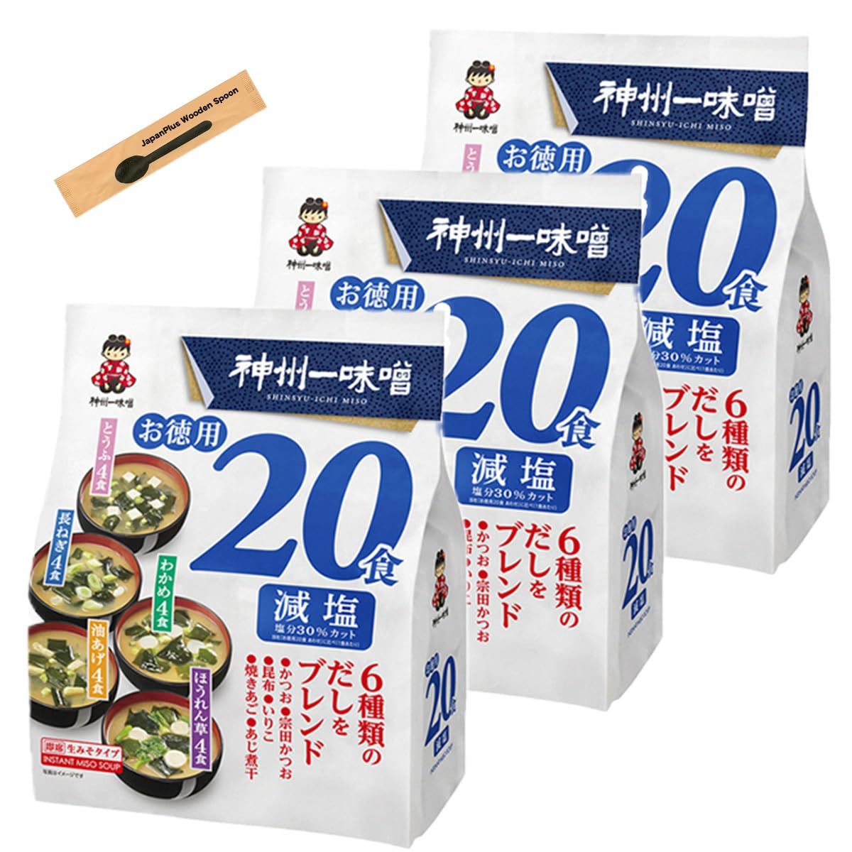 神州一 味噌 お徳用20食 減塩 味噌汁3種のだし5種の具材 減塩みそ汁 詰め合わせ ジャパンプラス木製スプーン付き (20食×3袋, 油あげ汁・わか