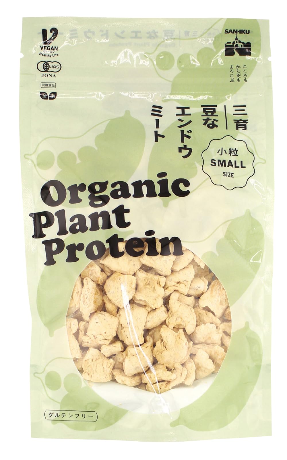 有機エンドウ豆と有機そら豆からつくられた乾燥の植物たんぱく食品です。製造の過程で、化学処理が一切されていない有機の乾燥たんぱく粒をチャック付きの包材にパックしました。(有機JAS、グルテンフリー、大豆フリー、五葷抜き)