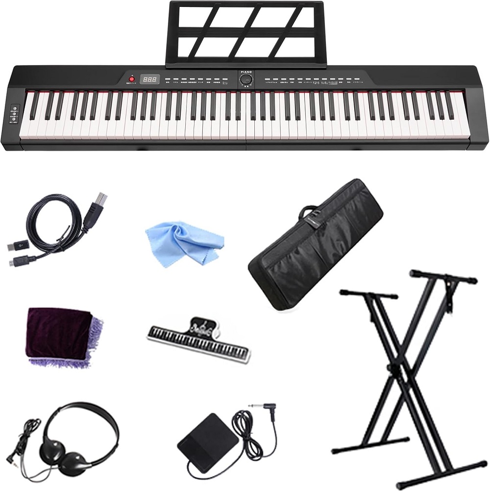 電子ピアノ 88鍵盤 ピアノスタンドセット 日本語表記 MIDI対応 200音色 200リズム 充電式 コンパクト スリム サステインペダル 収納バッグ付き 練習用イヤホン