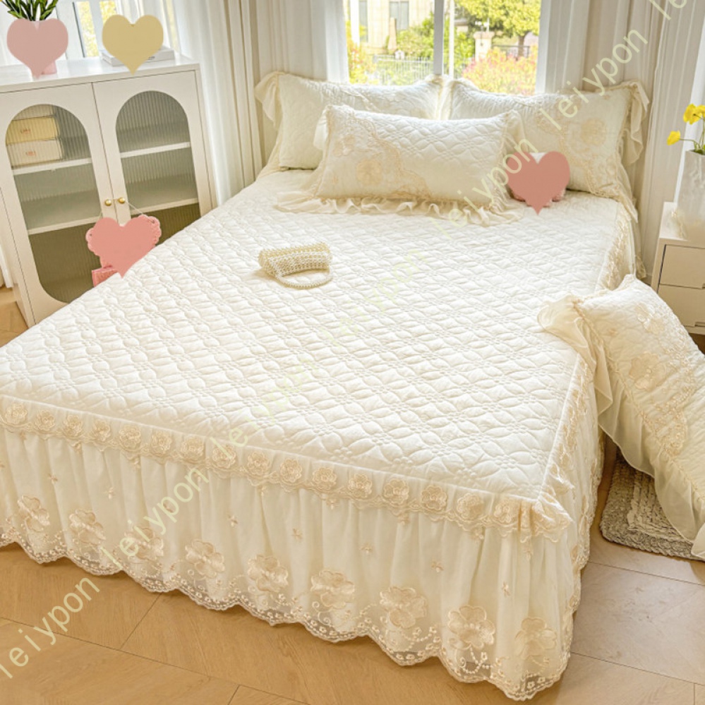 ベッドスカート 中綿入り コットン 姫系 洗いざらし 柔らかい レース付き ダブル セミダブル キング 優雅 きれいめ エレガント 上品 フリル ベッドカバー