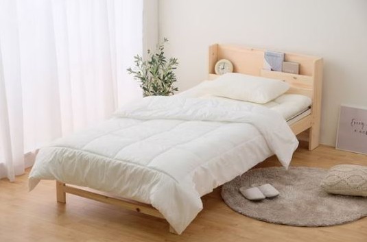 ふんわりとしたシングルサイズの掛け布団です。薄手タイプで軽量です。春夏は1枚、秋冬はお持ちのふとんと組み合わせることでオールシーズンお使いいただけます。中綿の偏りを防ぐキルト加工を施しています。格子状のため使用中に中綿が崩れにくくなっています。桃の皮の表面のような風合いを持つピーチスキン加工で、柔らかくなめらかな肌触りです。ループ付きで掛けふとんカバーとのズレを防ぎます。ご家庭で丸ごと洗濯可能なので、清潔を保てます。