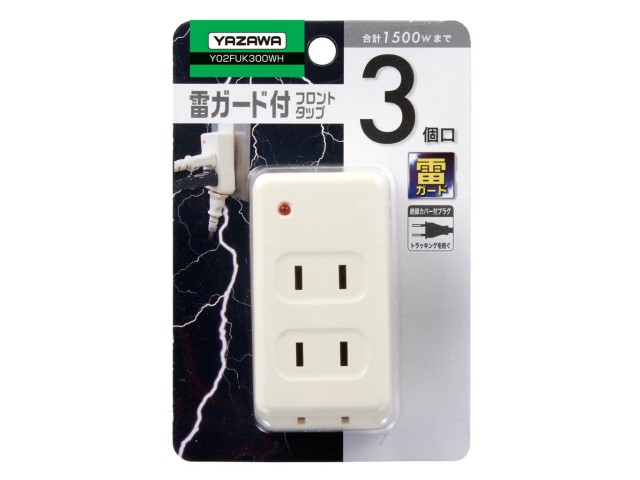 電源タップ 雷ガードタップ YAZAWA ヤザワ コンセント3口 前面2個口・下面1個口仕様 雷ガード 絶縁カバー 雷サージ付フロントタップ3個口 白 Y02FUK300WH