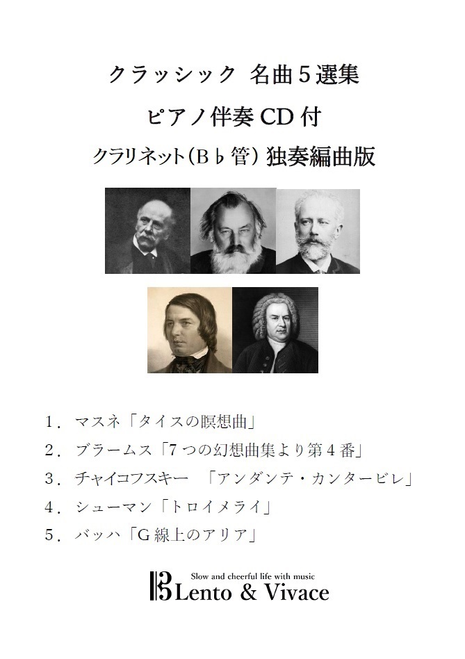 クラシックの名曲5曲を器楽独奏用に編曲しています。ピアノ伴奏CD付ですので、再生機があれば、いつでもどこでも一人で演奏を楽しめます。伴奏音源には、ガイドとなるメロディやクリック音は入っていませんので、発表会などでもご利用いただけます。そのため、演奏のし易いようにピアノ伴奏に原曲にはない前奏や一部ガイドとなる音を加えるなど編曲をしています。レント&ヴィヴァーチェは楽譜PDFと伴奏MP3データをセットにしてダウンロード販売しているサイトです。Yahooショッピングでは、楽譜を印刷し音楽データをCDに焼いて郵送販売をしています。(1)独奏用楽譜、(2)伴奏用楽譜、(3)伴奏CD をお送りいたします。ホームページではデモ演奏もお聞きいただけます。 曲目 1.マスネ「タイスの瞑想曲」 2.ブラームス「7つの幻想曲集より4番インターメッツォ」 3.チャイコフスキー「アンダンテ・カンタービレ」 4.シューマン「トロイメライ」 12.バッハ「G線上のアリア」 レント&ヴィヴァーチェのホームページでは、デモンストレーション演奏をご覧いただけ、他の曲目のダウンロード販売も行っています。